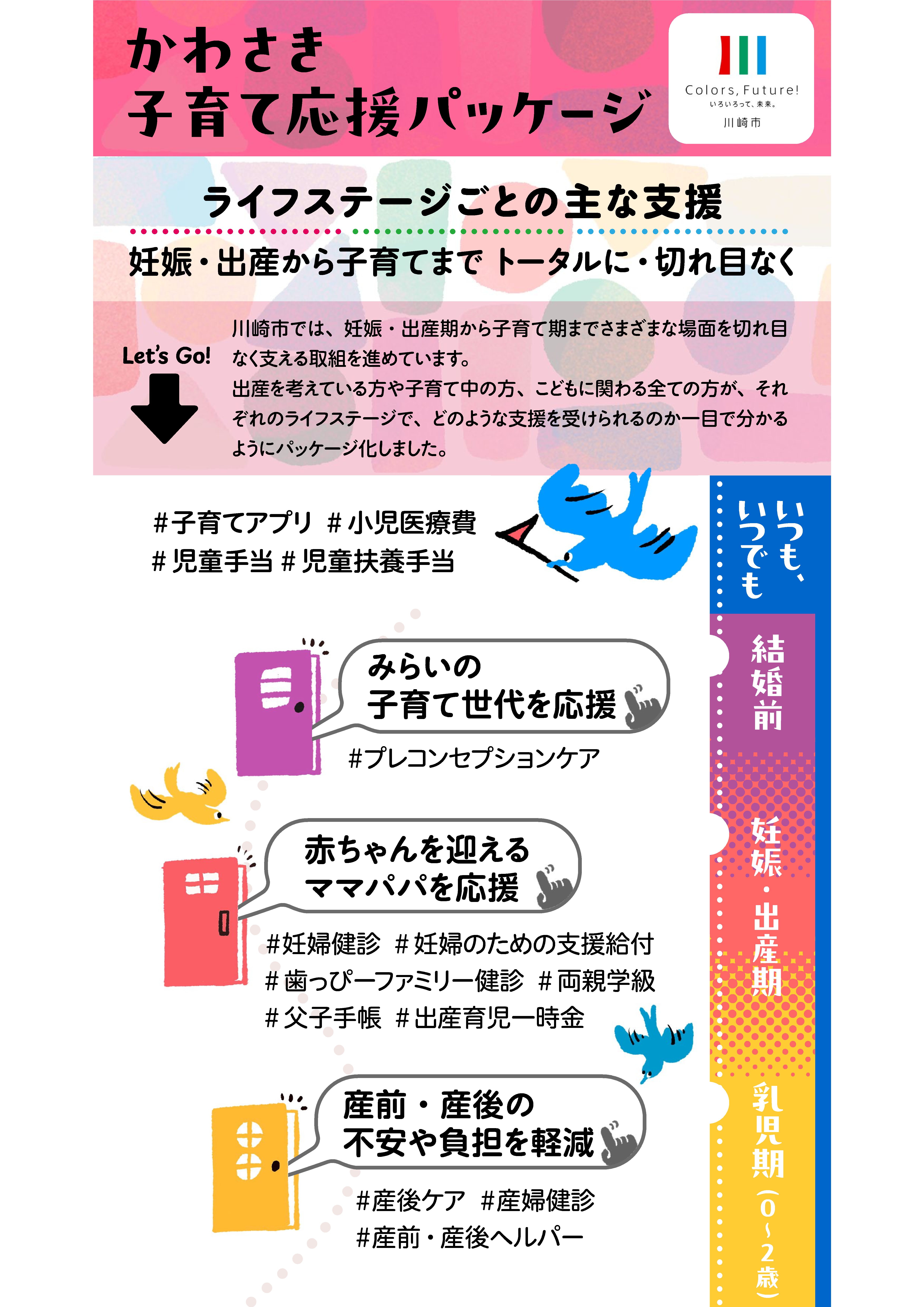 川崎市では、妊娠・出産期から子育て期までさまざまな場面を切り目なく支える取組を進めています。 出産を考えている方や子育て中の方、こどもに関わる全ての方が、それぞれのライフステージで、どのような支援を受けられるのか一目でわかるようにパッケージ化しました。(画像をタップすると詳細な内容を見ることができます)